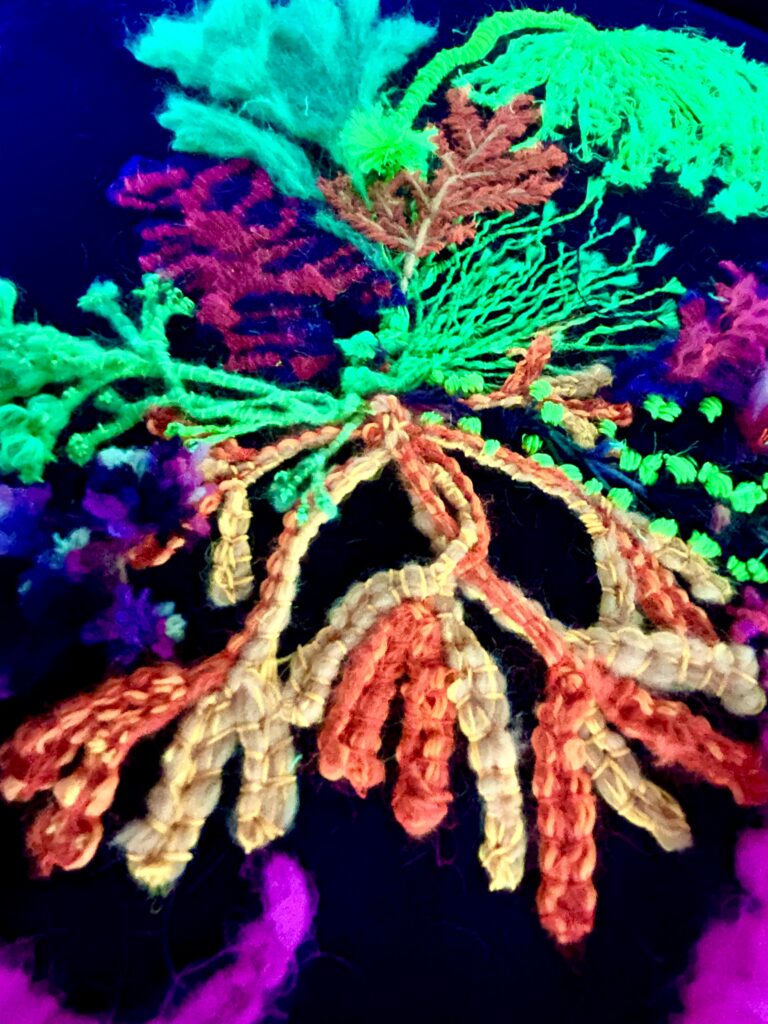 Threads of Icelandic seaweed species drift across the fabric, embroidered in UV-reactive yarns that shimmer like the currents beneath the surface.